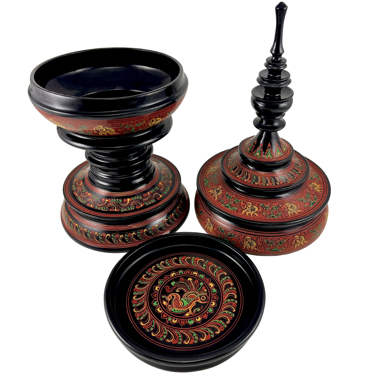 - Myanmar Lacquerware Royal traditional lunch box souvenir, - 7 inches wide, 15 inches high (from bottom to top) - Diameter 6 inches - High 15 inches - Product of Myanmar - It is souvenir and not for food serving.
